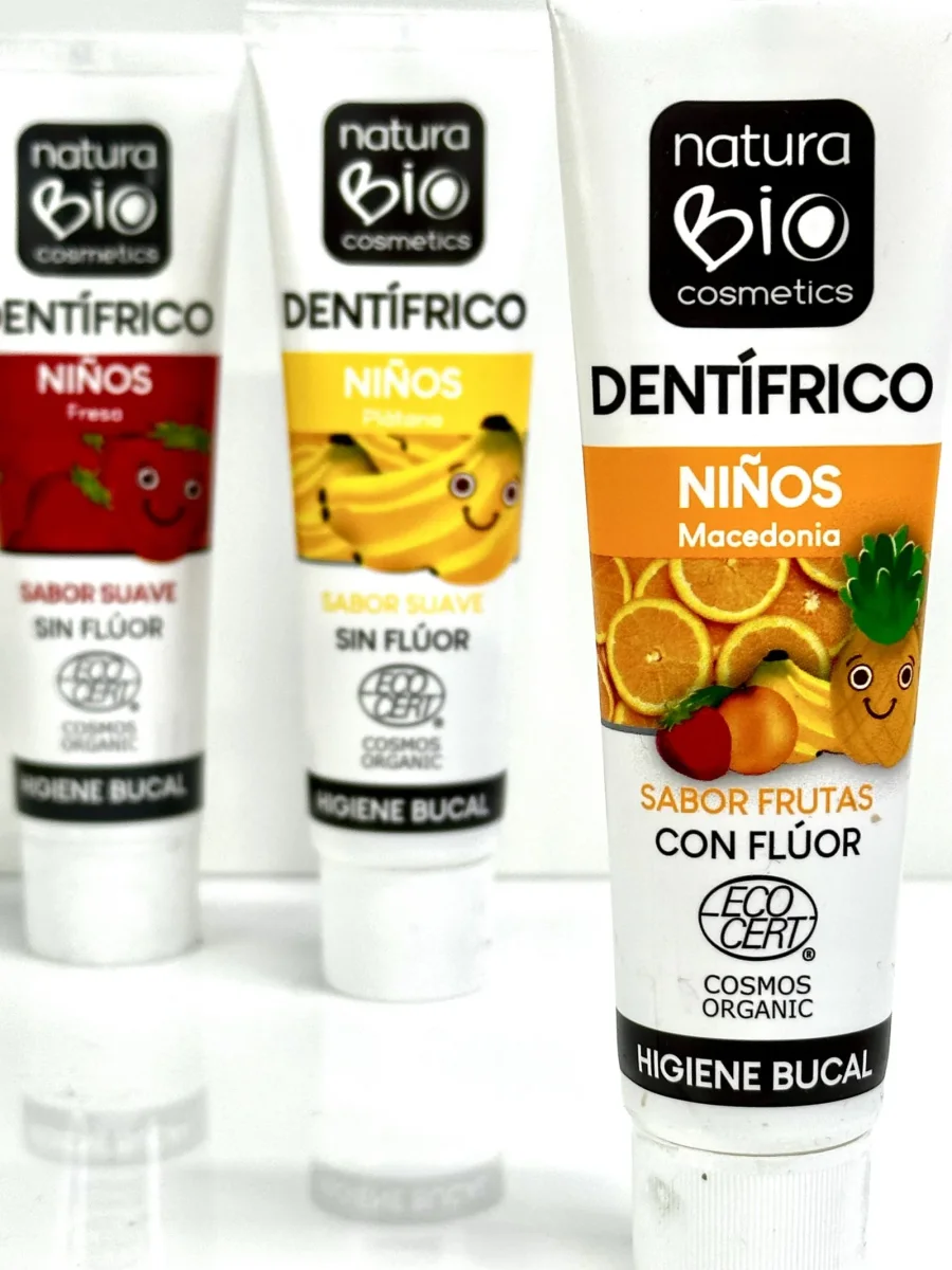 Dentifrico de macedonia para niños con fluor. Cuidado delicado de los dientes.