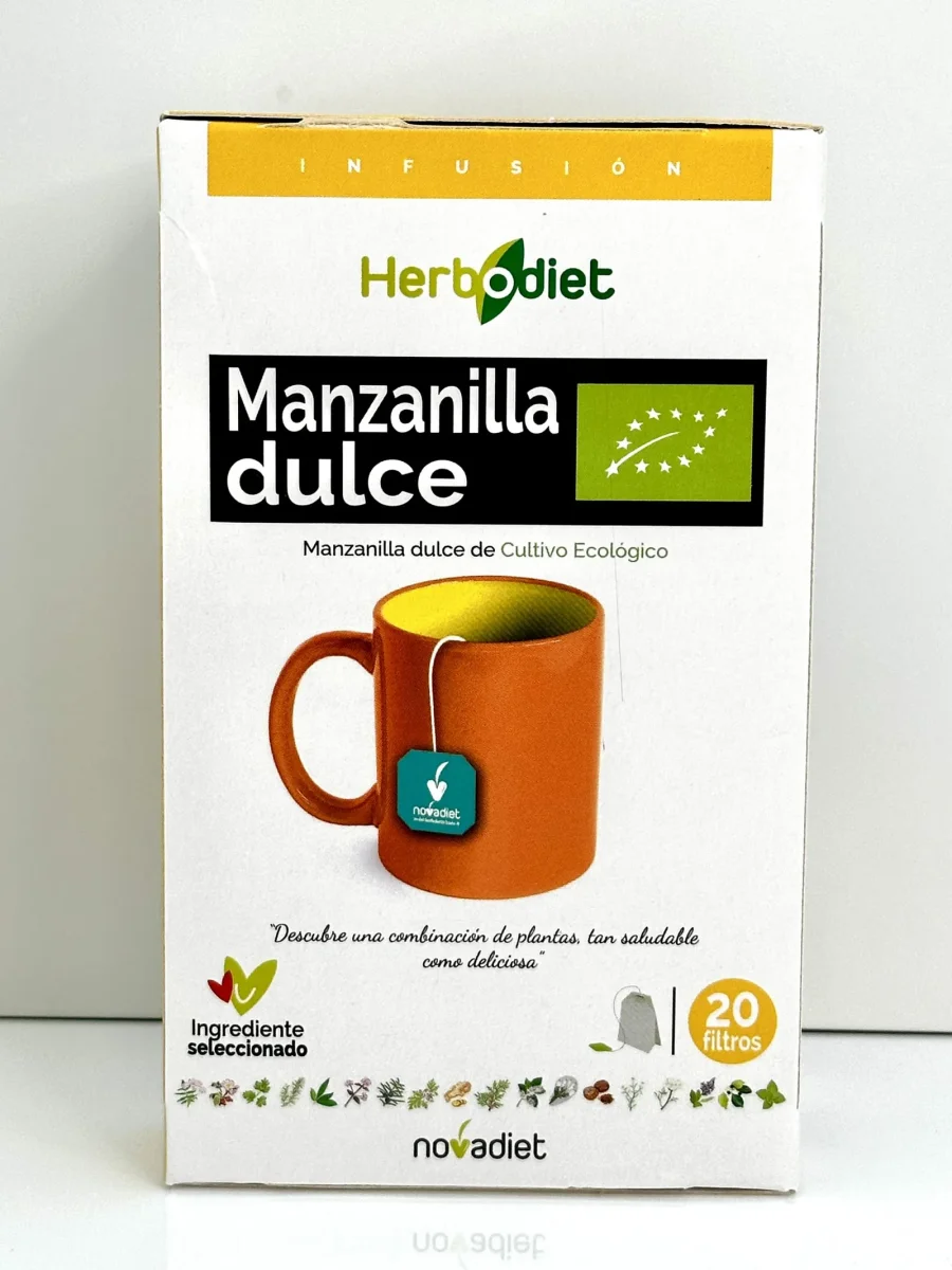 Herbodiet Manzanilla Dulce Eco de Nova Diet es una infusión delicada con un suave toque floral muy apreciada por sus propiedades digestivas.