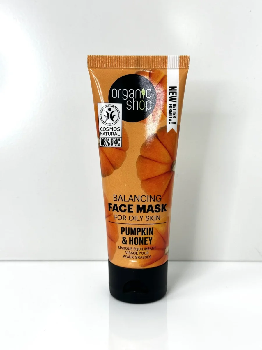 Nueva crema facial equilibrante Organic shop. Equilibra la hidratación y controla la producción excesiva de sebo en el rostro. Contiene aceite orgánico de calabaza y miel. Mascarilla facial que ayuda a controlar la oleosidad. Producto con ingredientes 99% de origen natural.