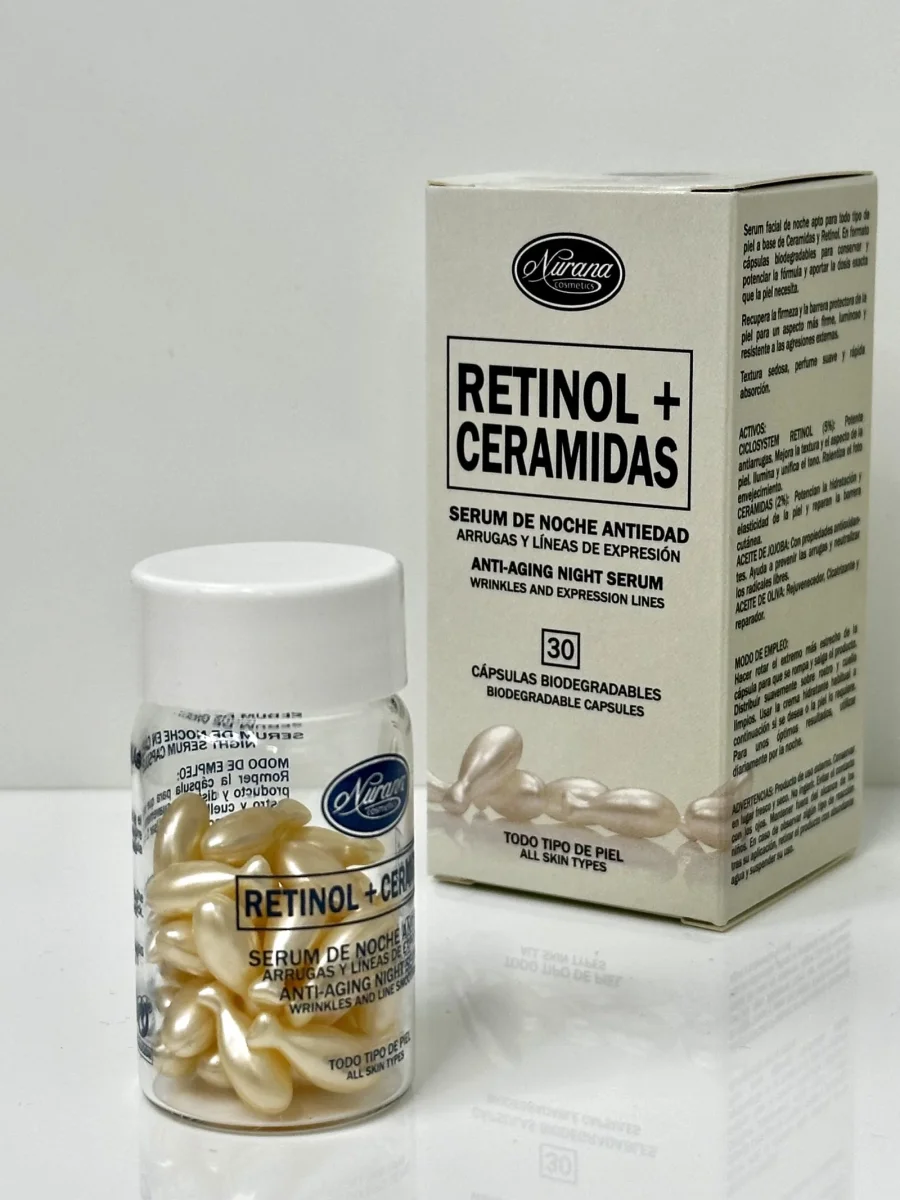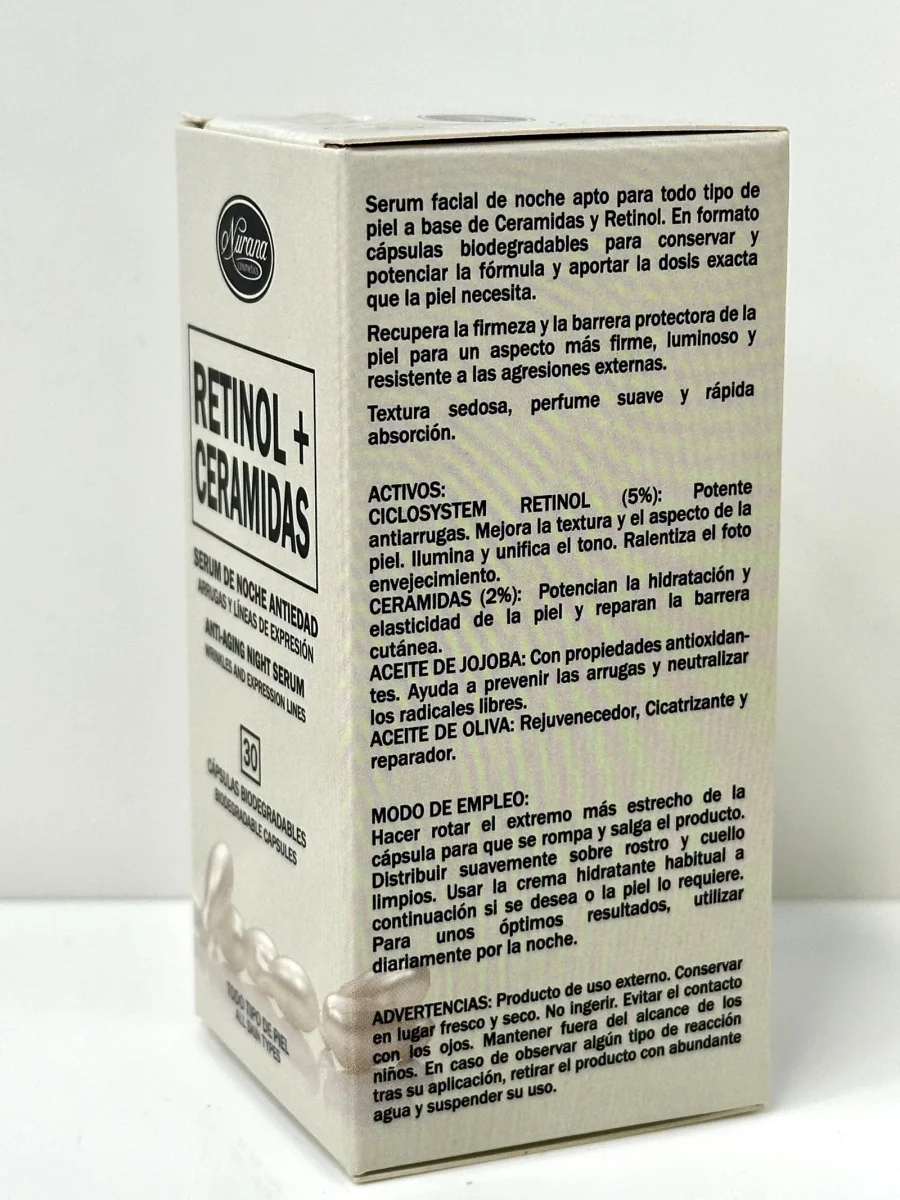 Serum facial de noche antiedad apto para todo tipo de piel a base de Ceramidas y Retinol. En formato cápsulas biodegradables para conservar y potenciar la formula y aportar la dosis exacta que la piel necesita.